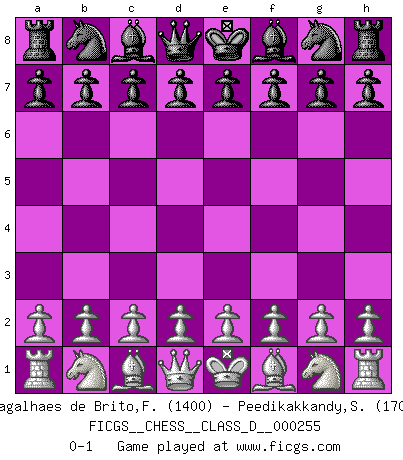 Last move : 0-1 2019 July 19 10:5:39 [Event "FICGS__CHESS__CLASS_D__000255"] [Site "FICGS"] [Date "2019.06.09"] [Round "1"] [White "Magalhaes de Brito,Francisco dieles"] [Black "Peedikakkandy,Sameer"] [Result "0-1"] [WhiteElo "1400"] [BlackElo "1700"] 0-1 This chess game has been lost on time (started : 2019.06.09 8:50:48) Player Black won this chess game. Follow this game move after move (download)Chess mastery essentially consists of analyzing Chess positions accurately. (Mikhail Botvinnik) Ich bin der einzige Schachspieler, der sich während der Vorbereitungen zum Turnier verletzt hat. (Woody Allen) Nada excita más a Grandes Maestros aburridos que una novedad teórica. (Dominic Lawson) La guerre est enfant de la passion, la passion est enfant du narcissisme et le narcissisme est l'enfant. (...) Une autre partie ? (Thibault de Vassal) Fame, I have already. Now I need the money. (an elderly Steinitz)