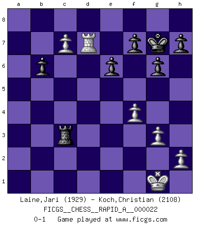 Last move : 0-1 2007 August 17 15:21:31 [Event "FICGS__CHESS__RAPID_A__000022"] [Site "FICGS"] [Date "2007.06.13"] [Round "1"] [White "Laine,Jari"] [Black "Koch,Christian"] [Result "0-1"] [WhiteElo "1929"] [BlackElo "2108"] 1.e4 c5 2.Nc3 Nc6 3.g3 g6 4.Bg2 Bg7 5.d3 d6 6.f4 e6 7.Nf3 Nge7 8.O-O O-O 9.Be3 b6 10.d4 Ba6 11.Re1 Qc7 12.a4 Rfd8 13.Nb5 Bxb5 14.axb5 Nxd4 15.Nxd4 cxd4 16.Bxd4 d5 17.Bxg7 Kxg7 18.Qd4+ Kg8 19.exd5 Nxd5 20.c3 Rac8 21.Ra4 Ne7 22.Qf2 Rd7 23.Rea1 Qd8 24.Rxa7 Rd2 25.Qe3 Rxb2 26.Bb7 Qd6 27.Bxc8 Nf5 28.Rd7 Qxd7 29.Bxd7 Nxe3 30.Bc6 Kg7 31.Ra6 Nc4 32.Ra4 Na5 33.Rd4 Rb3 34.Rd3 Nxc6 35.bxc6 Rb5 36.Rd7 Rc5 37.c7 Rxc3 0-1 Sicilian : Closed, 6.f4 Kingside Castling by player White (move 8) Kingside Castling by player Black (move 8) Player Black won this chess game. Follow this game move after move (download)When in doubt... play Chess ! (Tevis) Zum Sieg gelangt man nicht, wenn man gut, sondern nur wenn man besser spielt (Savielly Grigorievitsch Tartakower) Un jugador que trata de regresar una movida en el Ajedrez es un futuro carterista. (Richard Fenton) On croit qu'il y a plus de mauvais joueurs que de bons joueurs, c'est faux : Il y a autant de joueurs qui gagnent que de joueurs qui perdent. (Philippe Geluck) A mistake is only a mistake if you let it happen twice. Otherwise it is a learning experience. (Daniel Parmet)