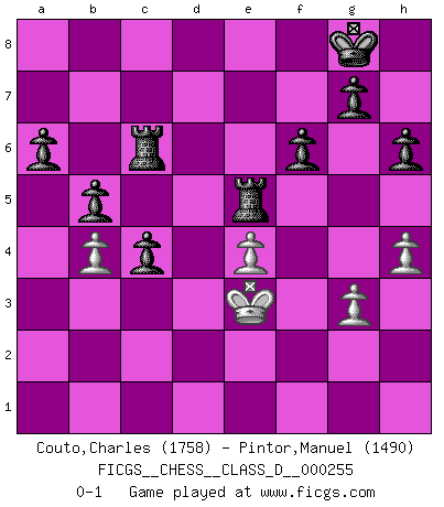 Last move : 0-1 2019 October 28 20:38:35 [Event "FICGS__CHESS__CLASS_D__000255"] [Site "FICGS"] [Date "2019.06.09"] [Round "1"] [White "Couto,Charles"] [Black "Pintor,Manuel"] [Result "0-1"] [WhiteElo "1758"] [BlackElo "1490"] 1.e4 e5 2.Nf3 Nc6 3.Nc3 Bc5 4.d3 h6 5.Be3 Bb4 6.a3 Bxc3+ 7.bxc3 d6 8.Rb1 Nf6 9.d4 exd4 10.cxd4 Nxe4 11.Rb3 O-O 12.Bd3 Nf6 13.O-O Bg4 14.h3 Bc8 15.c4 Na5 16.Rb5 c6 17.Rb4 b6 18.Re1 a6 19.Bf4 d5 20.c5 b5 21.Ne5 Nc4 22.Bxc4 dxc4 23.Nxc6 Qd7 24.Ne5 Qf5 25.Qb1 Qxf4 26.g3 Qxd4 27.Qc2 Nd5 28.Qe4 Qxe4 29.Rxe4 Nxb4 30.axb4 Be6 31.h4 Rfd8 32.Kg2 Bd5 33.f3 Bxe4 34.fxe4 Re8 35.c6 Rxe5 36.Kf3 Rc8 37.Kf4 f6 38.Ke3 Rxc6 0-1 Three knights game Kingside Castling by player Black (move 11) Kingside Castling by player White (move 13) Player Black won this chess game. Follow this game move after move (download)The winner of the game is the player who makes the next-to-last mistake. (Savielly Tartakover) Es ist im Leben wie im Schachspiel. Wir entwerfen einen Plan, dieser bleibt jedoch bedingt durch das, was im Schachspiel dem Gegner, im Leben dem Schicksal zu tun belieben wird. (Arthur Schopenhauer) Me dio la sensación de como si yo estuviera jugando en contra del mismo Ajedrez. - al estar jugando en contra de Robert Fischer (Walter Shipman) Lorsque vous vous retrouvez devant une position atroce, ne tendez pas un ultime piège dérisoire avec l'intention d'abandonner si l'adversaire le déjoue ! Faites-vous plutôt un devoir de résister comme si votre vie en dépendait. Jouez le coup qui vous déplairait au centuple si vous étiez dans la peau de votre tortionnaire ! Now be brave and don't look back. Don't look back. (Shmi Skywalker in Star Wars ep.1)