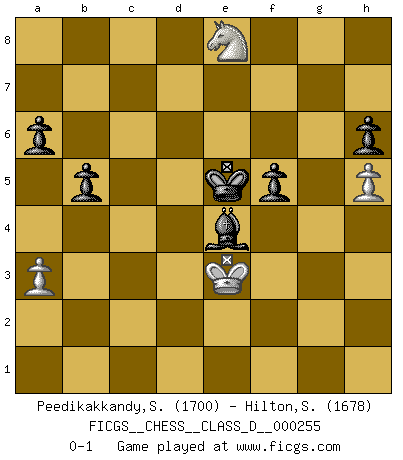 Last move : 0-1 2019 December 24 16:28:36 [Event "FICGS__CHESS__CLASS_D__000255"] [Site "FICGS"] [Date "2019.06.09"] [Round "1"] [White "Peedikakkandy,Sameer"] [Black "Hilton,Stephen"] [Result "0-1"] [WhiteElo "1700"] [BlackElo "1678"] 1.d4 d6 2.e4 Nf6 3.Nc3 Nbd7 4.Nf3 e5 5.dxe5 dxe5 6.Bc4 Be7 7.Be3 O-O 8.O-O c6 9.Re1 Qc7 10.a3 Nc5 11.b4 Ne6 12.h3 Rd8 13.Qc1 b5 14.Ba2 a6 15.Rd1 Bb7 16.Nd2 c5 17.bxc5 Nxc5 18.f3 Rac8 19.Ndb1 Rxd1+ 20.Qxd1 Rd8 21.Qe1 Ncd7 22.Bb3 Nb6 23.Qf2 Nc4 24.Bxc4 Qxc4 25.Qe2 Bc5 26.Bxc5 Qxc5+ 27.Kh2 Nh5 28.Na2 Nf4 29.Qf1 Qxc2 30.Nac3 Qd3 31.Qxd3 Rxd3 32.Ra2 f6 33.Rd2 Kf7 34.Rxd3 Nxd3 35.Nd2 Nc5 36.g4 Ke6 37.h4 h6 38.h5 Bc6 39.Kg3 Be8 40.Nd5 Kd6 41.f4 exf4+ 42.Kxf4 Bd7 43.Nf3 Ne6+ 44.Kf5 Ng5 45.Kf4 Nxf3 46.Kxf3 Ke5 47.Ke3 Bxg4 48.Nc7 Bc8 49.Ne8 Bb7 50.Nxg7 Bxe4 51.Ne8 f5 0-1 Queen's Pawn Kingside Castling by player Black (move 7) Kingside Castling by player White (move 8) 10 pieces endgame at move 50 : White KNPP , Black KBPPPP WHITE : King + 1 Knight 2 Pawns BLACK : King + 1 Bishop 4 Pawns Player Black won this chess game. Follow this game move after move (download)The defensive power of a pinned piece is only imaginary. (Aaron Nimzovich) Frage: Wie viele Autos haben Sie schon zerstört? - Antwort: Nur zwei. (Loek van Wely) Repentinamente, me resultaba obvio en mi analisis que yo había pasado por alto lo que Fischer había visto en el tablero con la mas grande facilidad. (Mikhail Botvinnik) Les Echecs ne sont pas pour les âmes timides. Ils requièrent un homme entier, qui ne s'arrête pas aveuglément à ce qui a été déjà établi, mais qui tente individuellement de sonder les profondeurs du jeu. (W. Steinitz) Life is painting a picture, not doing a sum. (Oliver Wendell Holmes, Jr.)