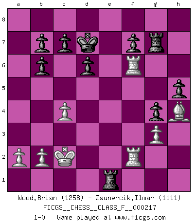 Last move : 1-0 2019 August 5 0:8:26 [Event "FICGS__CHESS__CLASS_F__000217"] [Site "FICGS"] [Date "2019.06.14"] [Round "1"] [White "Wood,Brian"] [Black "Zaunercik,Ilmar"] [Result "1-0"] [WhiteElo "1258"] [BlackElo "1111"] 1.e4 e5 2.f4 exf4 3.Nf3 Nc6 4.d4 g5 5.Nc3 g4 6.Ng1 Qh4+ 7.Ke2 d6 8.Bxf4 Bg7 9.g3 Nxd4+ 10.Qxd4 Qxh2+ 11.Rxh2 Bxd4 12.Rd1 Bxg1 13.Rh1 Bb6 14.Nd5 Bd7 15.c4 O-O-O 16.Nxb6+ axb6 17.Bg2 Nf6 18.Bg5 Nxe4 19.Bxe4 Rde8 20.Kd3 h5 21.Rhf1 Be6 22.Bf5 Bxf5+ 23.Rxf5 Rh7 24.Rf6 Re5 25.Bh4 Kd7 26.Rd2 Re1 27.Kc2 Rg7 28.Rf5 Ke6 29.Rf6+ Kd7 30.Rdf2 1-0 King's knight's gambit Queenside Castling by player Black (move 15) Player White won this chess game. Follow this game move after move (download)Winning isn't everything... but losing is nothing. (Mednis) Über Kasparov: Es ist offensichtlich, daß er in einem totalitären Staat aufwuchs und deshalb zu diktatorischen Zügen neigt. (Viktor Kortschnoi) ¿Porque tengo que perder ante este idiota?. (Aron Nimzovich) C'est une question de caractère, Beaucoup de gens perdent leur motivation très vite. D'autres, ils sont rares, peuvent la conserver très longtemps. J'aime les échecs, encore aujourd'hui je suis heureux d'analyser des parties. J'aime toujours gagner, je déteste encore perdre. Bien jouer est important pour mon intégrité intellectuelle et morale. Et puis les échecs vivent en ce moment une période historique grâce à Internet. Ils se développent dans les systèmes éducatifs à travers le monde. Ils sortent de leur ghetto, et c'est mon rôle de mener à bien cette révolution. (Gary Kasparov) Man with more than one clock never knows what time it is. (Chinese thought)