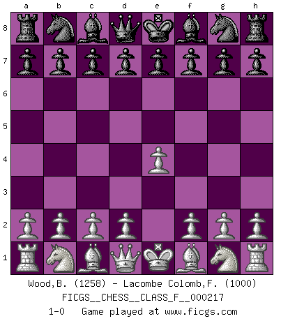Last move : 1-0 2019 July 24 11:39:21 [Event "FICGS__CHESS__CLASS_F__000217"] [Site "FICGS"] [Date "2019.06.14"] [Round "1"] [White "Wood,Brian"] [Black "Lacombe Colomb,Francois"] [Result "1-0"] [WhiteElo "1258"] [BlackElo "1000"] 1.e4 1-0 This chess game has been lost on time (started : 2019.06.14 1:7:52) King's pawn Opening Player White won this chess game. Follow this game move after move (download)Excellence at Chess is one mark of a scheming mind. (Sir Arthur Conan Doyle) Das Schachspiel hat wie die Liebe, die Musik, die Fähigkeit, den Menschen glücklich zu machen. Ich habe ein leises Gefühl des Bedauerns für jeden, der das Schachspiel nicht kennt, so wie ich jeden bedaure, der die Liebe nicht kennt. (Siegbert Tarrasch) El pensamiento metódico es mas útil en el Ajedrez que la inspiración. (C. J. S. Purdy) J'apprécie les joueurs d'est-indienne, c'est grâce à eux que je nourris ma famille depuis tant d'années. (Petrosian) I'll be back. (Arnold Schwarzenegger)