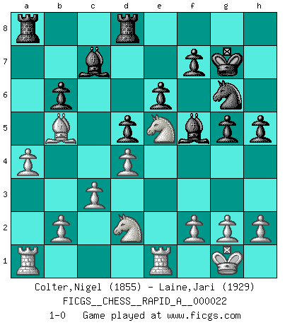 Last move : 1-0 2007 August 17 15:23:13 [Event "FICGS__CHESS__RAPID_A__000022"] [Site "FICGS"] [Date "2007.06.13"] [Round "1"] [White "Colter,Nigel"] [Black "Laine,Jari"] [Result "1-0"] [WhiteElo "1855"] [BlackElo "1929"] 1.e4 c6 2.d4 d5 3.exd5 cxd5 4.c3 Bf5 5.Bf4 e6 6.Bxb8 Rxb8 7.Qa4+ Ke7 8.Qxa7 Kf6 9.Qa4 Qb6 10.Qb5 Qxb5 11.Bxb5 Ra8 12.Nd2 Bd6 13.Ngf3 h5 14.O-O Ne7 15.Rfe1 g5 16.Ne5 Ng6 17.Nd7+ Kg7 18.Nb3 b6 19.a4 Bc7 20.Nd2 Rhd8 21.Ne5 1-0 Caro-Kann : Exchange variation Kingside Castling by player White (move 14) Player White won this chess game. Follow this game move after move (download)Chess is a terrible game. If you have no center, your opponent has a freer position. If you do have a center, then you really have something to worry about ! (Siegbert Tarrasch) Wer mein Gambit spielt, muß bereit sein, alle Brücken hinter sich abzubrechen. Es verändert den ganzen Menschen. Es wirkt wie ein Zauberstab und fördert verkümmerte, gute Charakter- eigenschaften wieder zu Tage. (Emil Joseph Diemer) Yo siempre he tenido un ligero sentimiento de lástima por una persona que no tiene conocimiento del Ajedrez. (Siegbert Tarrasch) On a dit que l'homme se distingue de l'animal par le fait qu'il achète plus de livres qu'il ne peut en lire. Je voudrais suggérer qu'inclure à la liste des livres quelques livres d'échecs rendrait la distinction manifeste. (Edward Lasker) Success without honor is an unseasoned dish; it will satisfy your hunger, but it won't taste good. (Joe Paterno)