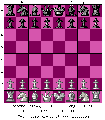 Last move : 0-1 2019 July 24 11:39:21 [Event "FICGS__CHESS__CLASS_F__000217"] [Site "FICGS"] [Date "2019.06.14"] [Round "1"] [White "Lacombe Colomb,Francois"] [Black "Tang,George"] [Result "0-1"] [WhiteElo "1000"] [BlackElo "1200"] 0-1 This chess game has been lost on time (started : 2019.06.14 1:7:52) Player Black won this chess game. Follow this game move after move (download)All I want to do, ever, is just play Chess. (Bobby Fischer) Kritik überlasse ich den Spießern. Ich zeige nichts, wofür ich mich schämen muss. (Alexandra Kosteniuk) Cuando tengas duda... ¡juega al Ajedrez!. (Tevis) Je crois qu'il existe des manières très spécifiques de jouer efficacement contre une machine. Evidemment, nous n'avons aucune chance en technique pure, parce que l'ordinateur calcule de manière parfaite. Mais lorsque nous faisons appel à notre cerveau, en utilisant l'intuition et la compréhension, alors nous restons beaucoup plus forts. (Anatoli Karpov) 98% of all statistics are made up. (Author unknown)