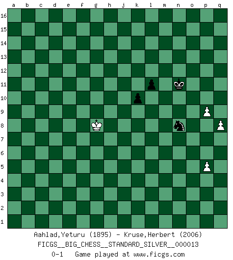 Last move : 0-1 2020 April 21 2:26:4 [Event "FICGS__BIG_CHESS__STANDARD_SILVER__000013"] [Site "FICGS"] [Date "2019.06.14"] [Round "1"] [White "Aahlad,Yeturu"] [Black "Kruse,Herbert"] [Result "0-1"] [WhiteElo "1895"] [BlackElo "2006"] 1.j2-k4 j15-k13 2.h1-o7 h15-g13 3.h2-g4 p16-o14 4.e2-e4 b16-c14 5.f1-b5 h16-q8 6.b1-c3 g16-j15 7.m2-m4 k16-h15 8.p1-o3 m15-m13 9.l1-p5 l16-p12 10.m1-m3 e15-e13 11.e1-e3 f16-c13 12.p5-o6 q8-b8 13.k1-h2 d15-d14 14.e3-f3 c16-l8 15.f3-f7 p12-m9 16.o7-l7 n15-n14 17.f7-b7 b8-j8 18.g4-h6 j8-f11 19.g1-f3 c13-k6 20.l7-f7 f11-f7 21.h6-f7 a16-b16 22.h2-g4 o16-j11 23.k4-m5 k6-m8 24.o6-m8 j11-m8 25.d2-d4 e16-e14 26.o3-n5 e14-f14 27.f3-e5 m16-m14 28.m3-p3 q16-p16 29.p3-p8 m8-j11 30.n5-l6 l8-n6 31.p8-p9 m9-g4 32.h3-g4 n6-m5 33.l6-k4 m5-f11 34.b7-b8 m14-l14 35.b8-p8 o14-n16 36.q2-q4 p15-p14 37.q4-q5 f14-f12 38.c3-d5 j11-n7 39.p9-n9 n7-k4 40.j3-k4 l14-l2 41.n9-l9 f12-l12 42.l9-l12 m13-l12 43.b5-f9 l2-l1 44.j1-h2 n16-p15 45.f9-m3 p16-m16 46.p8-o8 p15-o13 47.n2-n3 m16-m11 48.d5-f4 m11-l11 49.b2-b3 l1-f1 50.c1-b2 f1-f2 51.e5-g6 f2-c2 52.b2-a3 f11-b7 53.e4-e5 l11-a11 54.a3-c5 a11-a2 55.a1-a2 c2-a2 56.o1-n2 b7-f11 57.n2-o3 f11-o3 58.o8-o3 h15-j13 59.m3-f9 a2-a11 60.q1-l1 j16-h15 61.o3-o10 a11-b11 62.f9-a4 b16-m16 63.l1-l10 m16-m7 64.f7-h8 m7-p7 65.p2-p3 b11-q11 66.o10-q10 p7-q7 67.q10-q7 q11-q7 68.l10-l5 q7-o7 69.o2-o4 o7-p7 70.l5-p5 p7-n7 71.p5-n5 n7-p7 72.n5-p5 p7-p5 73.o4-p5 c14-d12 74.a4-g10 b15-b14 75.h8-j10 j15-h13 76.g6-h8 f15-f13 77.h8-k9 f13-f12 78.f4-g6 f12-f11 79.g10-f9 e13-e12 80.g6-j7 e12-e11 81.j10-l11 k13-l11 82.k9-l11 k15-k13 83.l11-n12 q15-q14 84.j7-h9 e11-e10 85.f9-d7 g13-h11 86.c5-o16 g15-g13 87.d7-b9 h15-j15 88.n12-l13 j13-k15 89.l13-k15 j15-k15 90.b9-h15 h13-f14 91.h15-g14 h14-h13 92.h9-j11 g13-g12 93.j11-k9 h11-j13 94.g14-d11 d12-e14 95.k9-m10 e14-f12 96.d11-f13 f14-d13 97.m10-n12 j13-k11 98.n12-l13 k11-l13 99.o16-l13 b14-b13 100.h2-h3 a15-a13 101.h3-h4 b13-b12 102.h4-h5 a13-a12 103.h5-j6 a12-a11 104.j6-k7 c15-c13 105.k7-k8 b12-b11 106.l13-k12 d13-e11 107.f13-d15 f12-g14 108.k8-l9 g12-g11 109.l9-m10 j14-j13 110.k12-e7 b11-b10 111.d15-e16 g14-f12 112.e7-f8 k15-j14 113.m10-n10 f12-d11 114.n10-o11 e10-e9 115.f8-l13 o13-m14 116.l13-m12 f11-f10 117.m12-p15 q14-q13 118.o11-o12 m14-n16 119.p15-f6 c13-c12 120.e16-a12 d14-d13 121.o12-p13 k13-k12 122.p13-q14 l12-l11 123.q14-q15 j14-k13 124.q15-p16 n16-m14 125.f6-h4 p14-p13 126.p16-p15 k13-l12 127.p15-q14 p13-p12 128.q14-q13 o15-o13 129.a12-f7 k12-k11 130.h4-p11 j13-j12 131.f7-k3 d11-f12 132.k3-q9 e11-g10 133.q13-p14 l12-m12 134.p11-l7 h13-h12 135.p14-o14 g10-j11 136.l7-o10 m12-m11 137.o14-n14 d13-d12 138.q9-p8 m11-n12 139.p8-g16 c12-c11 140.o10-h16 f12-e10 141.g16-c12 e10-d8 142.h16-d12 d8-c6 143.d12-c11 c6-d4 144.b3-b4 d4-c6 145.b4-b5 c6-e5 146.g4-g5 e5-f7 147.g5-g6 f7-d6 148.b5-b6 j11-h9 149.n14-m15 m14-k13 150.m15-l14 k13-m12 151.l14-l15 h9-f8 152.c11-b12 f8-d7 153.b12-a11 d7-b6 154.a11-b10 n12-m13 155.b10-f14 k11-k10 156.l15-k14 m12-k11 157.k14-k13 b6-d7 158.k13-j12 k11-h10 159.j12-h12 d7-f8 160.h12-g11 h10-j12 161.g11-f10 f8-g6 162.f10-e9 d6-f7 163.e9-e8 f7-h6 164.c12-h7 g6-f4 165.h7-o13 f4-g2 166.o13-p12 g2-f4 167.p12-q11 f4-h5 168.f14-c11 h6-j8 169.k4-k5 m13-n12 170.p5-p6 h5-k6 171.q11-n8 j12-l13 172.n8-l10 n12-n11 173.l10-j8 k6-j8 174.c11-h16 n11-m12 175.p6-p7 m12-m13 176.h16-l13 m13-l13 177.n3-n4 j8-l7 178.m4-m5 l7-k5 179.n4-n5 k5-l7 180.m5-m6 l7-n6 181.p7-p8 n6-l5 182.p3-p4 l5-m3 183.n5-n6 m3-k2 184.e8-f8 k2-m3 185.q5-q6 m3-l5 186.n6-n7 l5-n4 187.f8-g8 n4-m6 188.q6-q7 m6-l8 189.n7-n8 l8-m6 190.q7-q8 m6-n8 191.p4-p5 l13-m12 192.p8-p9 m12-n11 0-1 Follow this game move after move (download)The passed pawn is a criminal, who should be kept under lock and key. Mild measures, such as police surveillance, are not sufficient. (Nimzovitch) Smyslow ist ein Beweis dafür, dass ich noch zehn Jahre spielen kann! [der 75 jährige über den 85 jährigen] (Viktor Kortschnoi) Un Peón pasado es un criminal, quién debe ser mantenido bajo candado y llave. Leves medidas, tales como vigilancia policiaca, no son suficientes. (Aaron Nimzovich) Mon pion favori sur ma case favorite ! Bronstein en parlant d'un coup de pion en h5 quand il avait les Noirs. Men should grow up. - Yeah. And dogs should stop licking themselves. It's not gonna happen. (Gregory House to Dr. Cameron, House M.D.)