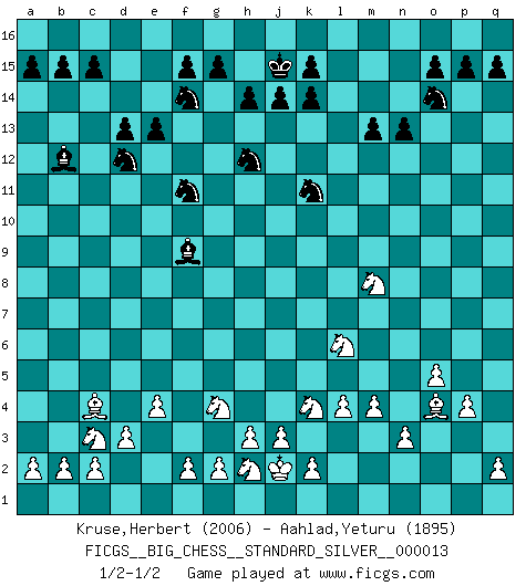 Last move : 1/2-1/2 2019 August 10 15:41:37 [Event "FICGS__BIG_CHESS__STANDARD_SILVER__000013"] [Site "FICGS"] [Date "2019.06.14"] [Round "2"] [White "Kruse,Herbert"] [Black "Aahlad,Yeturu"] [Result "1/2-1/2"] [WhiteElo "2006"] [BlackElo "1895"] 1.m2-m4 j15-k13 2.p1-o3 h16-o10 3.h2-g4 o10-c10 4.j2-k4 h15-g13 5.b1-c3 m15-m13 6.l1-p5 p16-o14 7.e2-e4 e15-e13 8.f1-b5 b16-c14 9.h1-p8 f16-b12 10.g1-j2 e16-e14 11.n2-n3 l16-p12 12.k1-h2 e14-f14 13.o1-f9 f14-f10 14.f9-e8 c10-e10 15.d2-d3 f10-p10 16.p8-j8 e10-j10 17.j8-j10 p10-j10 18.c1-l9 n15-n13 19.e1-e3 o16-f8 20.k4-l6 m16-m14 21.m1-m3 k13-m12 22.m3-k3 m14-k14 23.k3-k14 l15-k14 24.e3-f3 q16-l16 25.o3-n5 d15-d13 26.q1-m1 j10-o10 27.o2-o4 c16-o5 28.p2-p4 o5-q7 29.o4-o5 l16-l11 30.l9-m8 o10-h10 31.l2-l4 k16-l14 32.m1-m3 l11-k11 33.m3-k3 g16-f14 34.k3-k11 m12-k11 35.m8-j11 h10-h8 36.j11-f8 h8-f8 37.f3-f8 b12-f8 38.a1-e1 j16-j15 39.e1-e3 a16-l16 40.e3-f3 f8-b12 41.f3-f7 q7-n10 42.f7-l7 l14-m12 43.l7-l16 p12-l16 44.j2-k4 c14-d12 45.l6-m8 n10-k13 46.e8-k13 m12-k13 47.n5-l6 l16-m15 48.p5-o4 g13-f11 49.b5-c4 k13-h12 50.j1-j2 m15-f9 1/2-1/2 Follow this game move after move (download)Fischer sacrificed virtually everything most of us weakies (to use his term) value, respect, and cherish, for the sake of an artful, often beautiful board game, for the ambivalent privilege of being its greatest master. (Paul Kollar) Der Bart als Geschlechtszeichen mitten im Gesicht ist obszön. Daher gefällt er den Weibern. [Zugegeben, kein Schachzitat, aber unglaublich originell] (Arthur Schopenhauer) Algunos sacrificios son sólidos, los demás son míos. (Mikhail Tal) Avec des compensations pour le matériel en plus... (Anonyme) It is not titles that honor men, but men that honor titles. (Niccolo Machiavelli)