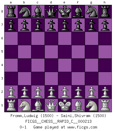 Last move : 0-1 2019 July 16 4:24:20 [Event "FICGS__CHESS__RAPID_C__000213"] [Site "FICGS"] [Date "2019.06.15"] [Round "1"] [White "Fromm,Ludwig"] [Black "Saini,Shivram"] [Result "0-1"] [WhiteElo "1500"] [BlackElo "1500"] 0-1 This chess game has been lost on time (started : 2019.06.15 22:46:44) Player Black won this chess game. Follow this game move after move (download)An attack on the wing should be met by play in the center. (Nimzovitch) Frage: Wie viele Autos haben Sie schon zerstört? - Antwort: Nur zwei. (Loek van Wely) Un entendimiento a fondo de las continuaciones típicas del mate, hace de las combinaciones de sacrificio mas complicadas conducirlas a ellas no solo sin dificultad, sino casi de una manera natural. (Siegbert Tarrasch) Les Echecs sont affaire de jugement sensible. Savoir quand frapper et quand esquiver. (Fischer) All the biggest technological inventions created by man - the airplane, the automobile, the computer - says little about his intelligence, but speaks volumes about his laziness. (Mark Kennedy)