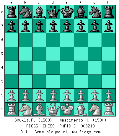 Last move : 0-1 2019 July 16 4:24:20 [Event "FICGS__CHESS__RAPID_C__000213"] [Site "FICGS"] [Date "2019.06.15"] [Round "1"] [White "Shukla,Pranav"] [Black "Nascimento,Hailton Correa"] [Result "0-1"] [WhiteElo "1500"] [BlackElo "1500"] 0-1 This chess game has been lost on time (started : 2019.06.15 22:46:44) Player Black won this chess game. Follow this game move after move (download)Chess problems demand from the composer the same virtues that characterize all worthwhile art: originality, invention, conciseness, harmony, complexity, and splendid insincerity. (Vladimir Nabokov) Ich würde mich als ganz normalen Jungen bezeichnen [Im Alter von 12]. (Sergej Karjakin) Coloca el contenido del tablero de Ajedrez en un sombrero, agita las piezas vigorosamente, derrámalas en el tablero desde una altura de medio metro y así obtienes el estilo de Wilhelm Steinitz. (H. E. Bird) Même un GMI sait rarement calculer sur plus de cinq coups une attaque à sacrifices. (Rudolf Spielmann) A good book on your shelf is a friend that turns its back on you and remains a friend. (Author unknown)