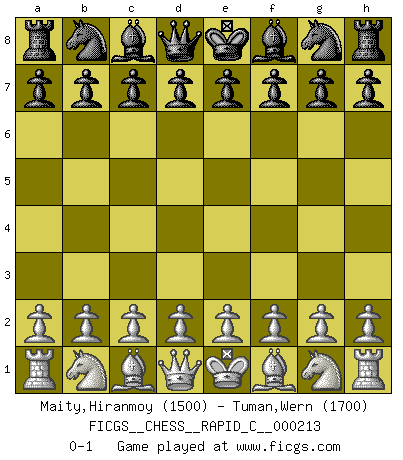 Last move : 0-1 2019 July 16 4:24:20 [Event "FICGS__CHESS__RAPID_C__000213"] [Site "FICGS"] [Date "2019.06.15"] [Round "1"] [White "Maity,Hiranmoy"] [Black "Tuman,Wern"] [Result "0-1"] [WhiteElo "1500"] [BlackElo "1700"] 0-1 This chess game has been lost on time (started : 2019.06.15 22:46:44) Player Black won this chess game. Follow this game move after move (download)Becoming successful at Chess allows you to discover your own personality. That's what I want for the kids I teach. (Saudin Robovic) Die größte Kunst beim Schach besteht darin dem Gegner nicht zu zeigen was er tun kann. (Garry Kasparov) Una victoria por una combinación errónea, aunque sea espectacular, me llena de horror artístico. (Wilhelm Steinitz) Botvinnik disait en comparant les échecs à la musique: Il existe une science dont le but est l'étude de l'acoustique et des sons. Mais il y a aussi un art qui se sert de l'océan des sons : c'est la musique. De toute évidence, il en est de même pour la pensée. La logique est l'étude des lois de la réflexion et les échecs reflètent, en tant qu'art, le côté logique de la réflexion, sous la forme d'images artistiques... Extrait de Fischer - Spassky, Reykjavik 1972 par Alexander & F. Wyndham (Ed. Solar), p 37. There are three kinds of lies: lies, damned lies and statistics. (Mark Twain)