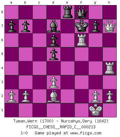 Last move : 1-0 2019 August 5 0:43:32 [Event "FICGS__CHESS__RAPID_C__000213"] [Site "FICGS"] [Date "2019.06.15"] [Round "1"] [White "Tuman,Wern"] [Black "Nurcahyo,Dery"] [Result "1-0"] [WhiteElo "1700"] [BlackElo "1642"] 1.e4 e5 2.f4 Nf6 3.fxe5 Nxe4 4.Nf3 Nc5 5.d4 Ne6 6.Bc4 d6 7.d5 Nc5 8.O-O Be7 9.Ng5 Bxg5 10.Qh5 O-O 11.Bxg5 Qe8 12.e6 Ne4 13.e7 f6 14.exf8Q+ Qxf8 15.Be3 Nd7 16.Bd3 Ndc5 17.Nd2 Nxd3 18.cxd3 Nxd2 19.Bxd2 Bd7 20.Rac1 c6 21.Rc4 Re8 22.Rh4 cxd5 23.Qxh7+ Kf7 24.Rxf6+ 1-0 KGD : 2...Nf6 Kingside Castling by player White (move 8) Kingside Castling by player Black (move 10) Promotion Queen by player White (move 14) Player White won this chess game. Follow this game move after move (download)I give 98 percent of my mental energy to Chess. Others give only 2 percent. (Bobby Fischer) Oft bringt ein stiller Zug das Erdbeben. (Richard Reti) Dios mío, Bobby Fischer juega tan simple. (Alexei Suetin) Plusieurs personnes se sont demandées comment Tal faisait pour gagner... En fait, c'est très simple ! Il met ses pièces au centre de l'échiquier et les sacrifie quelque part ! (David Bronstein) The difference between stupidity and genius is that genius has its limits. (Murphy)