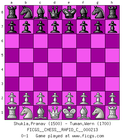 Last move : 0-1 2019 July 16 4:24:20 [Event "FICGS__CHESS__RAPID_C__000213"] [Site "FICGS"] [Date "2019.06.15"] [Round "1"] [White "Shukla,Pranav"] [Black "Tuman,Wern"] [Result "0-1"] [WhiteElo "1500"] [BlackElo "1700"] 0-1 This chess game has been lost on time (started : 2019.06.15 22:46:44) Player Black won this chess game. Follow this game move after move (download)White lost because he failed to remember the right continuation and had to think up the moves himself. (Siegbert Tarrasch) Sitze auf Deine Hände. (Siegbert Tarrasch) El Ajedrez es en su esencia, un juego. En su forma, un arte. Y en su ejecución, una ciencia. (Baron Tassilo) Les échecs sont un jeu terrible. Si vous n'avez pas le centre, votre adversaire a une position plus libre. Par contre, si vous avez le centre, alors vous avez vraiment quelque chose pour laquelle vous inquiéter ! (Siegbert Tarrasch) You think that education is too expensive ? Try ignorance. (Derek Bok)