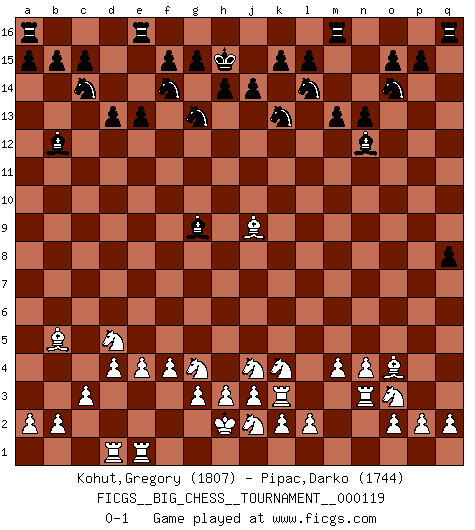 Last move : 0-1 2019 July 27 1:40:41 [Event "FICGS__BIG_CHESS__TOURNAMENT__000119"] [Site "FICGS"] [Date "2019.06.17"] [Round "1"] [White "Kohut,Gregory"] [Black "Pipac,Darko"] [Result "0-1"] [WhiteElo "1807"] [BlackElo "1744"] 1.j2-k4 j15-k13 2.p1-o3 h15-g13 3.h1-o7 n15-n14 4.m2-m4 k16-l14 5.e2-e4 g16-f14 6.f1-b5 d15-d13 7.d2-d3 e15-e13 8.l1-o4 m15-m13 9.b1-c3 b16-c14 10.n2-n4 p16-o14 11.o1-f9 h16-l13 12.m1-m3 l13-k12 13.g1-j2 c16-h11 14.h2-g4 h11-f9 15.b5-f9 n14-n13 16.k1-h2 l16-q11 17.m3-k3 f16-b12 18.c1-k8 j16-h15 19.q1-n1 q11-p12 20.n1-n3 k12-l11 21.k8-j9 l11-f11 22.f9-b5 f11-o11 23.o7-o11 p12-o11 24.f2-f3 o16-f8 25.c3-d5 q15-q13 26.c2-c3 o11-n12 27.h2-j4 f8-g9 28.j1-h2 q13-q12 29.g2-g3 q12-q11 30.f3-f4 q11-q10 31.d3-d4 q10-q9 32.a1-d1 q9-q8 0-1 Follow this game move after move (download)There must have been a time when men were demigods, or they could not have invented Chess. (Gustav Schenk) Jeder leidlich begabte Spieler, er braucht keineswegs hervorragend veranlagt zu sein, kann es zum Meister bringen. Aber das ist ja auch gar nicht nötig! Der richtige Standpunkt ist es, zu seinem Vergnügen zu spielen, und man glaube ja nicht, dass der Genuss proportional dem Können sei. (Siegbert Tarrasch) No es una movida, aún la mejor movida que tu debas buscar, sino un plan comprensible. (Eugene Znosko-Borovsky) Il s'avisa de me proposer d'apprendre les échecs qu'il jouait un peu... me voilà forcené des échecs. J'achète un échiquier, je m'enferme dans ma chambre, j'y passe des jours et des nuits à vouloir apprendre par cur toutes les parties. (Jean-Jacques Rousseau, Confessions) Knowledge will give you power, but character respect. (Bruce Lee)