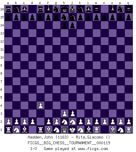 Last move : 1-0 2019 June 17 13:46:7 [Event "FICGS__BIG_CHESS__TOURNAMENT__000119"] [Site "FICGS"] [Date "2019.06.17"] [Round "1"] [White "Hadden,John"] [Black "Rita,Giacomo"] [Result "1-0"] [WhiteElo "1163"] [BlackElo ""] 1.e2-e4 1-0 Follow this game move after move (download)If cunning alone were needed to excel, women would be the best Chess players. (Albin) Du kannst im Schach nur gut werden, wenn du das Spiel liebst. (Robert James Fischer) El ganar no lo es todo... pero el perder es nada. (Mednis) Le pion, dans sa simplicité, marche droit devant lui, mais lorsqu'il prend, il le fait obliquement? Ainsi l'homme, tant qu'il reste pauvre, marche dans la droiture et vit honnêtement, mais lorsqu'il recherche les honneurs, il flatte, se parjure et, par les voies obliques, cherche une position supérieure sur l'échiquier du monde. (Jean de Galles) He is a liar. I just don't know what the lie is yet. (Horatio Caine, C.S.I. Miami)