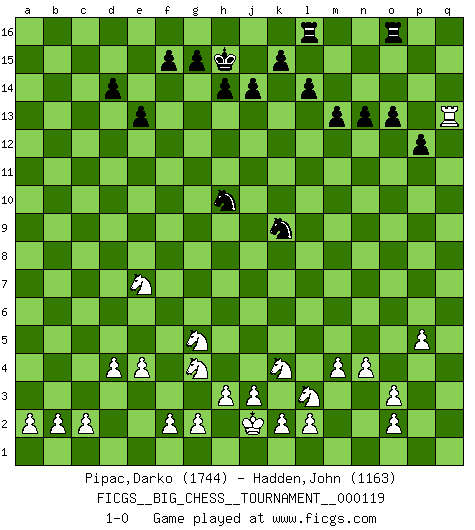 Last move : 1-0 2019 September 24 20:55:21 [Event "FICGS__BIG_CHESS__TOURNAMENT__000119"] [Site "FICGS"] [Date "2019.06.17"] [Round "1"] [White "Pipac,Darko"] [Black "Hadden,John"] [Result "1-0"] [WhiteElo "1744"] [BlackElo "1163"] 1.j2-k4 o15-o14 2.h2-g4 j15-k13 3.k1-l3 n15-n13 4.g1-f3 d15-d14 5.n2-n4 g16-f14 6.m2-m4 e15-e13 7.p1-o3 c16-p4 8.q2-q3 p4-o3 9.p2-o3 m15-m13 10.d2-d4 l15-l14 11.h1-m5 b16-c14 12.o1-b13 a15-a14 13.b13-c14 b15-c14 14.m5-c14 e16-c16 15.e2-e4 h15-g13 16.f1-b5 l16-p12 17.b5-g10 p16-n15 18.c14-c10 k16-h15 19.g10-a16 c16-a16 20.c10-c15 f14-e12 21.q3-q4 h15-f14 22.c15-b15 a16-e16 23.b15-a14 n15-o13 24.c1-l9 o16-k12 25.a14-c12 o13-m12 26.l9-g13 e12-g13 27.c12-k12 f16-e15 28.q1-p1 q15-q13 29.l1-p5 f14-h13 30.k12-n15 q16-p16 31.n15-o15 h16-j15 32.j1-j2 j16-h15 33.b1-c3 h13-j11 34.c3-d5 e16-l16 35.d5-e7 l16-l15 36.o15-p14 m12-o13 37.p5-j11 k13-j11 38.p1-p12 q13-p12 39.p14-o13 j15-k16 40.o13-p12 k16-l16 41.p12-l16 l15-l16 42.m1-p1 p15-p13 43.p1-p6 o14-o13 44.e1-p1 p13-p12 45.p6-q6 p16-q16 46.p1-p6 g13-f11 47.f3-g5 f11-h10 48.a1-p1 j11-k9 49.p6-o6 q16-q6 50.o6-q6 e15-j11 51.q6-q13 m16-o16 52.p1-p5 j11-p5 53.q4-p5 1-0 Follow this game move after move (download)Don't even mention losing to me. I can't stand to think of it. (Bobby Fischer) Ich habe kein Problem mit Frauen, sondern nur mit dem Niveau ihres Schachspiels (Judith Polgar) Un Peón pasado es un criminal, quién debe ser mantenido bajo candado y llave. Leves medidas, tales como vigilancia policiaca, no son suficientes. (Aaron Nimzovich) Donnez-moi un Cavalier en 6e et je gagnerais toutes mes parties. (Steinitz) There is no vagueness without wind. (Chinese proverb)