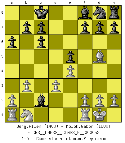 Last move : 1-0 2007 September 5 19:18:18 [Event "FICGS__CHESS__CLASS_E__000053"] [Site "FICGS"] [Date "2007.06.15"] [Round "1"] [White "Berg,Allen"] [Black "Kolok,Gabor"] [Result "1-0"] [WhiteElo "1400"] [BlackElo "1600"] 1.e4 e5 2.Nf3 Nc6 3.Bb5 a6 4.Bxc6 dxc6 5.O-O Bg4 6.d3 Qf6 7.b3 O-O-O 8.Bg5 Bxf3 9.Bxf6 Bxd1 10.Bxd8 Bxc2 11.Bg5 1-0 This chess game has been lost on time (started : 2007.06.15 3:38:1) Ruy Lopez : Exchange variation, 5.O-O Kingside Castling by player White (move 5) Queenside Castling by player Black (move 7) Player White won this chess game. Follow this game move after move (download)Tactics flow from a superior position. (Bobby Fischer) Glücklicherweise sind Großmeister Ruben Fines reine Schachbücher weniger phallozentrisch [als seine Schachpsychologie] und deswegen auch weniger lächerlich. (Nigel Short) Yo nunca en mi vida he jugado la Defensa Francesa, que viene siendo la más aburrida de todas las Aperturas. (Wilhelm Steinitz) Fischer est le meilleur joueur du monde et Karpov n'est qu'un joueur de bistrot. (Garry Kasparov, agé de 16 ans) Beep ! (R2D2 in Star Wars ep.3)