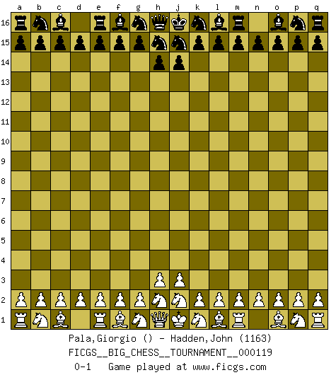 Last move : 0-1 2019 July 17 6:32:46 [Event "FICGS__BIG_CHESS__TOURNAMENT__000119"] [Site "FICGS"] [Date "2019.06.17"] [Round "1"] [White "Pala,Giorgio"] [Black "Hadden,John"] [Result "0-1"] [WhiteElo ""] [BlackElo "1163"] 0-1 This big chess game has been lost on time (started : 2019.06.17 2:52:8) Follow this game move after move (download)There's never before been a Chess player with such a thorough knowledge of the intricacies of the game and such an absolutely indomitable will to win. I think Bobby is the greatest player that ever lived. (Lisa Lane) Obendrein hat der FIDE-Präsident den Revolutionsführer Gaddafi zum »Großmeister« ernannt, am Ende der WM. Das ist lächerlich! (Joel Lautier) El Jaque al descubierto es el bombardero del tablero. (Reuben Fine) Mais l'homme est une créature légère et illogique : semblable au joueur d'échecs, il n'aime que le processus du but à atteindre, non le but lui-même. (Dostoïevsky) Two beer, or not two beer. (Unknown)