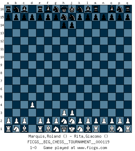 Last move : 1-0 2019 June 17 13:46:55 [Event "FICGS__BIG_CHESS__TOURNAMENT__000119"] [Site "FICGS"] [Date "2019.06.17"] [Round "1"] [White "Marquis,Roland"] [Black "Rita,Giacomo"] [Result "1-0"] [WhiteElo ""] [BlackElo ""] 1.d2-d4 1-0 Follow this game move after move (download)A great player and a great example for many. His book My 60 Memorable Games had a big impact on me. It is a shame he didn't continue to enrich the world of chess with his unparalleled understanding after 1972. (Jan Timman, about Bobby Fischer's death) Wie, soll nun auch die Opposition abgeschafft werden? Ja, es tut mir leid, Ihnen diesen Schmerz nicht ersparen zu können. (Aaron Nimzowitsch) Cuando tu casa esta en llamas, no puedes ser molestado por tus vecinos. O, como decinos en Ajedrez, si tu Rey esta bajo ataque, no te preocupa perder un Peón del lado de la Reina. (Gary Kasparov) Nous sommes les pions de la mystérieuse partie d'Echecs jouée par Dieu. Il nous déplace, nous arrête, nous pousse encore, puis nous lance un à un dans la boîte du Néant. Epitaphe sur la tombe de David Janowsky (1868-1927). Man is still the most extraordinary computer of all. (John F. Kennedy)