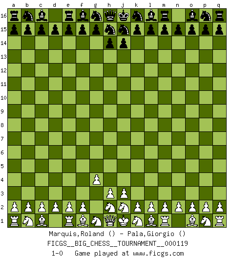 Last move : 1-0 2019 July 17 6:32:46 [Event "FICGS__BIG_CHESS__TOURNAMENT__000119"] [Site "FICGS"] [Date "2019.06.17"] [Round "1"] [White "Marquis,Roland"] [Black "Pala,Giorgio"] [Result "1-0"] [WhiteElo ""] [BlackElo ""] 1.g2-g4 1-0 This big chess game has been lost on time (started : 2019.06.17 2:52:8) Follow this game move after move (download)Chess is a part of culture and if a culture is declining then Chess too will decline. (Mikhail Botvinnik) Wenn Du nicht kämpfst, um anderen etwas zu beweisen, sondern nur für Dich selbst, dann bist du fast unbesiegbar. (Garry Kasparov) Ser exitoso en el Ajedrez te permite descubrir tu propia personalidad. Eso es lo que deseo para los niños de mi clase. (Saudin Robovic) L'attaque fait le spectacle, la défense gagne les matchs. (Dicton footballistique) Big Chess is a place for big hallucinations. (Thibault de Vassal)