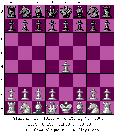 Last move : 1-0 2019 July 27 16:18:21 [Event "FICGS__CHESS__CLASS_B__000307"] [Site "FICGS"] [Date "2019.06.17"] [Round "1"] [White "Slawomir,Weglicki"] [Black "Turetskiy,Mark"] [Result "1-0"] [WhiteElo "1966"] [BlackElo "1800"] 1.e4 1-0 This chess game has been lost on time (started : 2019.06.17 13:18:30) King's pawn Opening Player White won this chess game. Follow this game move after move (download)The Pin is mightier than the sword. (Fred Reinfeld) Im Blitz ist es einfacher mit einer Figur weniger anzugreifen, als sich mit einer Mehrfigur zu verteidigen. (Mikhail Nekhemyevich Tal) En partidas rápidas, el Caballo es mas poderoso que el Alfil. (Vlastimil Hort) Pour moi, les échecs ne sont pas un jeu mais un art. (Alexandre Alekhine) When you have everything, sometimes it feels like nothing. (Horatio Caine, C.S.I. Miami)