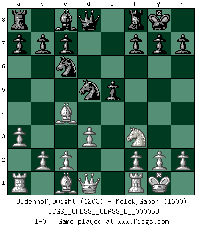 Last move : 1-0 2007 August 4 20:2:43 [Event "FICGS__CHESS__CLASS_E__000053"] [Site "FICGS"] [Date "2007.06.15"] [Round "1"] [White "Oldenhof,Dwight"] [Black "Kolok,Gabor"] [Result "1-0"] [WhiteElo "1203"] [BlackElo "1600"] 1.e4 e5 2.Nf3 Nc6 3.Nc3 Nf6 4.Bc4 Bb4 5.Nd5 O-O 6.Nxb4 Nxb4 7.a3 Nc6 8.d3 d5 9.exd5 Nxd5 10.O-O 1-0 This chess game has been lost on time (started : 2007.06.15 3:38:1) Four knights : Italian variation Kingside Castling by player Black (move 5) Kingside Castling by player White (move 10) Player White won this chess game. Follow this game move after move (download)What is the difference between chess and football? Everybody understands football, but nobody plays it. Everybody plays chess, but nobody understands it. Everything is relative. (Vladimir Kramnik) Mutter, ich bin eben Ex-Weltmeister geworden. --beim nach Hause Kommen nach dem Verlust des WM-Titels an Mihail Botvinnik -- (Mikhail Nekhemyevich Tal) El jugador táctico debe saber que hacer cuando algo se debe de hacer. El estratégico debe saber que hacer cuando nada se debe de hacer. (Savielly Tartakover) On est toujours la mazette de quelqu'un d'autre. (Anonyme) I've never seen so many men wasted so badly. (Blondie in The Good, The Bad and The Ugly)