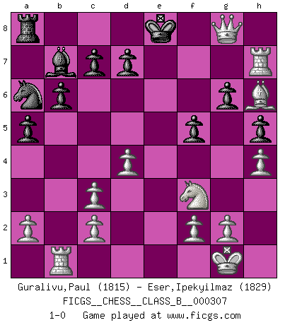 Last move : 1-0 2019 December 5 5:43:42 [Event "FICGS__CHESS__CLASS_B__000307"] [Site "FICGS"] [Date "2019.06.17"] [Round "1"] [White "Guralivu,Paul"] [Black "Eser,Ipekyilmaz"] [Result "1-0"] [WhiteElo "1815"] [BlackElo "1829"] 1.d4 f6 2.e4 e6 3.Nc3 Bb4 4.Bd3 b6 5.Qg4 g6 6.Nf3 Bb7 7.O-O Bxc3 8.bxc3 a6 9.Qh3 a5 10.Ba3 Na6 11.Rfe1 Kf7 12.Rab1 Kg7 13.Bc1 h6 14.Qg3 Ne7 15.h4 h5 16.e5 Nf5 17.Bxf5 exf5 18.exf6+ Qxf6 19.Bg5 Qc6 20.Re7+ Kg8 21.Qe5 Rh7 22.Bh6 Qe6 23.Rg7+ Kf8 24.Rxh7 Ke8 25.Qh8+ Qg8 26.Qxg8+ 1-0 This chess game has been lost on time (started : 2019.06.17 13:18:30) Queen's pawn Kingside Castling by player White (move 7) Player White won this chess game. Follow this game move after move (download)The battle for the ultimate truth will never be won. And that's why Chess is so fascinating. (Hans Kmoch) Um dein Spiel zu verbessern musst du zuallererst das Endspiel studieren, denn diese kann unabhängig studiert werden. Die Eröffnung und das Mittelspiel müssen immer in Bezug gesetzt werden zum Endspiel. (José Raúl Capablanca) Fischer es una tragedia del Ajedrez Americano a la par con Morphy y Pillsbury. (Mig Greengard) Si rien de grave n'est détecté lors de l'analyse d'une position, on joue alors le coup. Seconde règle de Blumenfeld. We cannot be sure of having something to live for unless we are willing to die for it. (Ernesto Che Guevara)