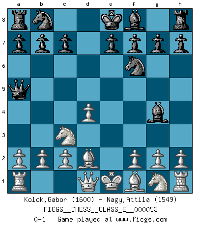 Last move : 0-1 2007 August 20 16:32:2 [Event "FICGS__CHESS__CLASS_E__000053"] [Site "FICGS"] [Date "2007.06.15"] [Round "1"] [White "Kolok,Gabor"] [Black "Nagy,Attila"] [Result "0-1"] [WhiteElo "1600"] [BlackElo "1549"] 1.e4 d5 2.exd5 Qxd5 3.Nc3 Qa5 4.d4 Nf6 5.Bd2 Bg4 0-1 This chess game has been lost on time (started : 2007.06.15 3:38:1) Scandinavian (centre counter) defense Player Black won this chess game. Follow this game move after move (download)Chess holds its master in its own bonds, shackling the mind and brain so that the inner freedom of the very strongest must suffer. (Albert Einstein) Kleine Schachspieler machen Mist, und große Schachspieler machen Mist, aber große machen weniger Mist. (Fritz Sämisch) Una clavada es mas poderosa que una espada. (Fred Reinfeld) Tout change constamment, y compris dans le monde des Echecs. (Botvinnik) When you stop learning you start dying. (Scott Adams)