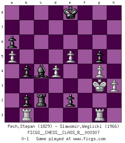 Last move : 0-1 2020 January 27 19:38:6 [Event "FICGS__CHESS__CLASS_B__000307"] [Site "FICGS"] [Date "2019.06.17"] [Round "1"] [White "Pech,Stepan"] [Black "Slawomir,Weglicki"] [Result "0-1"] [WhiteElo "1829"] [BlackElo "1966"] 1.d4 Nf6 2.c4 e6 3.Nc3 Bb4 4.e3 O-O 5.Bd3 d5 6.Nf3 b6 7.O-O Bb7 8.cxd5 exd5 9.a3 Bd6 10.b4 a6 11.Qb3 Re8 12.a4 h6 13.Ba3 c6 14.a5 b5 15.h3 Nbd7 16.Nd2 Nf8 17.Rfe1 Bc8 18.Qc2 Ra7 19.Rad1 Rae7 20.Nf3 Rc7 21.Rb1 Ng6 22.Bxg6 fxg6 23.Qxg6 Re6 24.Qc2 Rf7 25.Rbd1 Qe7 26.Bb2 Ne4 27.Nxe4 Rxe4 28.Ne5 Bxe5 29.dxe5 Rc4 30.Bc3 c5 31.Qd2 cxb4 32.Ba1 Be6 33.Bb2 b3 34.Qd3 Rc2 35.Rd2 Qb4 36.Red1 Rfc7 37.f4 Qe4 38.Qxe4 dxe4 39.Kf2 b4 40.g4 g6 41.Kg3 Kf7 42.Bd4 Rd7 43.Rf2 Ke8 44.Rg2 Bc4 45.Rb1 g5 46.fxg5 hxg5 47.Rf2 Rxd4 48.exd4 e3 49.Rg2 e2 50.R2g1 b2 0-1 Nimzo-Indian : 4.e3 O-O, 5.Bd3 d5 Kingside Castling by player Black (move 4) Kingside Castling by player White (move 7) Player Black won this chess game. Follow this game move after move (download)The combination player thinks forward; he starts from the given position, and tries the forceful moves in his mind. (Emanuel Lasker) Wenn du gegen Bobby spielst, ist es keine Frage von gewinnen oder verlieren. Es ist eine Frage des Überlebens. (Boris Vassilievich Spassky) Los libros de Ajedrez deben de usarse igual como usamos los anteojos: para mejorar la vista, aunque algunos jugadores los quieren usar como si ellos les otorgaran la vision. (José Raúl Capablanca) L'attaque fait le spectacle, la défense gagne les matchs. (Dicton footballistique) Gambling : The sure way of getting nothing from something. (Wilson Mizner)