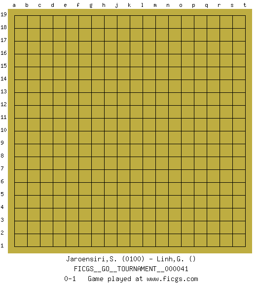 Last move : 0-1 2019 July 18 7:47:2 [Event "FICGS__GO__TOURNAMENT__000041"] [Site "FICGS"] [Date "2019.06.17"] [Round "1"] [Black "Jaroensiri,Siwaphong"] [White "Linh,Gaothu"] [Result "0-1"] [Rating 1 "0100"] 0-1 This go game has been lost on time (started : 2019.06.17 22:49:26) Here are the names of the openings (joseki) played in the four corners : Player White won this Go (weiqi, baduk) game. Follow this game move after move (download)Each step in a ladder is worth 7 points. (Anonymous) Either move or be moved. (Ezra Pound)