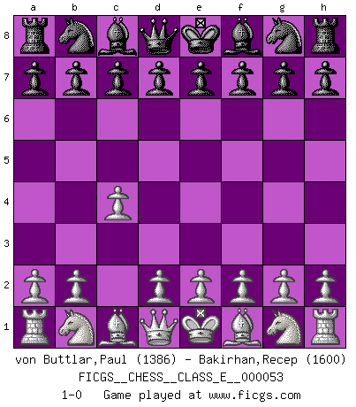 Last move : 1-0 2007 July 25 12:36:57 [Event "FICGS__CHESS__CLASS_E__000053"] [Site "FICGS"] [Date "2007.06.15"] [Round "1"] [White "von Buttlar,Paul"] [Black "Bakirhan,Recep"] [Result "1-0"] [WhiteElo "1386"] [BlackElo "1600"] 1.c4 1-0 This chess game has been lost on time (started : 2007.06.15 3:38:1) English Opening Player White won this chess game. Follow this game move after move (download)Avoid the crowd. Do your own thinking independently. Be the Chess player, not the Chess piece. (Ralph Charell) Schach ist mein Leben, meine Leidenschaft, was ich gelernt habe und seit meinem 14. Lebensjahr profimässig praktiziere. Darauf zu verzichten, würde mir sehr schwer fallen. (Viktor Kortschnoi) El juego de Damas es para vagabundos. (Paul Morphy) Aux échecs, les retours au sommet sont rares : les dommages psychologiques consécutifs à une défaite sont trop sévères. (Daily Telegraph) The existence of forgetting has never been proved: We only know that some things don't come to mind when we want them. (Friedrich Nietzsche)