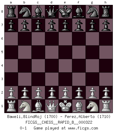 Last move : 0-1 2019 July 20 11:47:12 [Event "FICGS__CHESS__RAPID_B__000322"] [Site "FICGS"] [Date "2019.06.20"] [Round "1"] [White "Baweli,BlindRoj"] [Black "Perez,Alberto"] [Result "0-1"] [WhiteElo "1700"] [BlackElo "1710"] 0-1 This chess game has been lost on time (started : 2019.06.20 0:31:31) Player Black won this chess game. Follow this game move after move (download)Is Bobby Fischer quite sane ? (Salo Flohr) Ich suche im Schach immer etwas Eigenes. Riskantes Spiel im Stile schachlicher Musketiere ist nicht meine Sache, auch wenn es vielen Freunden scharfer Wendungen gefällt. (Anatoly Karpov) Una mala movida nulifica cuarenta buenas. (Horowitz) Karpov est une pièce de musée. (Garry Kasparov) Now be brave and don't look back. Don't look back. (Shmi Skywalker in Star Wars ep.1)