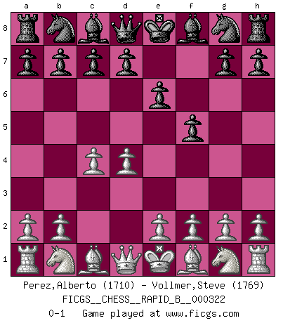 Last move : 0-1 2019 July 22 15:1:22 [Event "FICGS__CHESS__RAPID_B__000322"] [Site "FICGS"] [Date "2019.06.20"] [Round "1"] [White "Perez,Alberto"] [Black "Vollmer,Steve"] [Result "0-1"] [WhiteElo "1710"] [BlackElo "1769"] 1.d4 f5 2.c4 e6 0-1 This chess game has been lost on time (started : 2019.06.20 0:31:31) Dutch defense Player Black won this chess game. Follow this game move after move (download)Chess is a beautiful mistress. (Bent Larsen) Woher wissen wir, daß der Neanderthaler Blindschach gespielt hat? -- Bei Ausgrabungen wurden keine Schachbretter und Figuren gefunden. (Anonymous) La señal de un Gran Maestro es su habilidad de ganar una partida rápidamente y sin dolor. (Irving Chernev) Nous vivons dans un monde échiquéen : chaque jour qui passe est un défi à relever. (Philosophe Sasha) The only thing that matters is the evidence. (Horatio Caine, C.S.I. Miami)