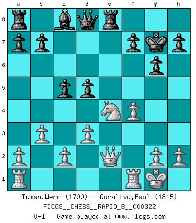 Last move : 0-1 2019 July 28 11:42:29 [Event "FICGS__CHESS__RAPID_B__000322"] [Site "FICGS"] [Date "2019.06.20"] [Round "1"] [White "Tuman,Wern"] [Black "Guralivu,Paul"] [Result "0-1"] [WhiteElo "1700"] [BlackElo "1815"] 1.e4 c5 2.Nc3 Nc6 3.f4 g6 4.b3 d6 5.Bb2 Bg7 6.Nf3 Nf6 7.Nd5 O-O 8.Nxf6+ exf6 9.Be2 Re8 10.d3 f5 11.Bxg7 Kxg7 12.Nd2 fxe4 13.Nxe4 Nd4 14.O-O Nxe2+ 15.Qxe2 d5 0-1 Sicilian : Grand Prix attack Kingside Castling by player Black (move 7) Kingside Castling by player White (move 14) Player Black won this chess game. Follow this game move after move (download)If Chess is a science, it's a most inexact one. If Chess is an art, it is too exacting to be seen as one. If Chess is a sport, it's too esoteric. If Chess is a game, it's too demanding to be just a game. If Chess is a mistress, she's a demanding one. If Chess is a passion, it's a rewarding one. If Chess is life, it's a sad one. (Unknown) Du musst Deinen Gegner in einen tiefen dunklen Wald führen wo 2+2=5 ist und wo der Weg, der wieder hinausführt, nur breit genug für einen ist. (Mikhail Nekhemyevich Tal) El jugador táctico sabe que hacer cuando hay algo que hacer; mientras que el estratega sabe que hacer cuando no hay nada que hacer. (Gerald Abrahams) Les réformistes prétendent que les progrès de la théorie conduiront à la disparition des échecs, et qu'il faut, pour leur rendre vie, en remanier les règles. En réalité, qu'exprime cette affirmation? Le mépris de l'intuition, de l'imagination et de tous les autres éléments qui font des échecs un art. (Alexander Alekhine) There will be no order, only chaos. (Sol Robeson in Pi by Darren Aronofsky)