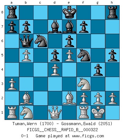 Last move : 0-1 2019 July 1 10:48:33 [Event "FICGS__CHESS__RAPID_B__000322"] [Site "FICGS"] [Date "2019.06.20"] [Round "1"] [White "Tuman,Wern"] [Black "Gossmann,Ewald"] [Result "0-1"] [WhiteElo "1700"] [BlackElo "2051"] 1.e4 e6 2.d4 d5 3.e5 c5 4.c3 Nc6 5.Nf3 Qb6 6.Be2 cxd4 7.cxd4 Nh6 8.b3 Nf5 9.Bb2 h5 10.O-O Bd7 11.a3 Be7 12.b4 g5 13.b5 g4 0-1 French : Advance, Paulsen attack Kingside Castling by player White (move 10) Player Black won this chess game. Follow this game move after move (download)Nowadays, when you're not a grandmaster at 14, you can forget about it. (Anand Viswanathan) Das Schach ist nichts für kleine Geister, es beansprucht einen vollen Mann, der sich nicht sklavisch an das Überlieferte hält, sondern selbständig die Tiefen des Spiels zu ergründen sucht. (Wilhelm Steinitz) El Ajedrez es un juego terrible. Si no dominas el centro, tu oponente tiene una posición mas libre. Si tu tienes el centro, entonces realmente tienes algo de que preocuparte. (Siegbert Tarrasch) Lorsque vous vous retrouvez devant une position atroce, ne tendez pas un ultime piège dérisoire avec l'intention d'abandonner si l'adversaire le déjoue ! Faites-vous plutôt un devoir de résister comme si votre vie en dépendait. Jouez le coup qui vous déplairait au centuple si vous étiez dans la peau de votre tortionnaire ! There are two kinds of tragedy in this world, one is not getting what you want and the other is getting. (Lord of war)
