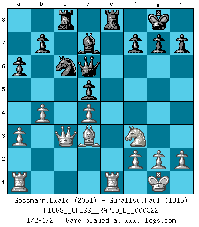 Last move : 1/2-1/2 2019 July 28 19:15:52 [Event "FICGS__CHESS__RAPID_B__000322"] [Site "FICGS"] [Date "2019.06.20"] [Round "1"] [White "Gossmann,Ewald"] [Black "Guralivu,Paul"] [Result "1/2-1/2"] [WhiteElo "2051"] [BlackElo "1815"] 1.e4 c5 2.Nf3 d6 3.Bb5+ Nc6 4.O-O Bd7 5.Re1 Nf6 6.c3 Qb6 7.Na3 e6 8.d4 cxd4 9.cxd4 d5 10.exd5 Nxd5 11.Bd3 Bb4 12.Nc4 Qc7 13.Bd2 O-O 14.Ne3 Bxd2 15.Nxd5 exd5 16.Qxd2 Qd6 17.a3 Rfe8 18.b4 a6 19.Qc3 Rac8 1/2-1/2 Sicilian : Canal-Sokolsky (Nimzovich-Rossolimo, Moscow) attack Kingside Castling by player White (move 4) Kingside Castling by player Black (move 13) This chess game ended in a draw. Follow this game move after move (download)Any material change in a position must come about by mate, a capture, or a Pawn promotion. (Purdy) Es hat in meinem Leben Zeiten gegeben, da ich sehr nahe daran war zu glauben, daß ich auch nicht eine einzige Schachpartie verlieren könnte. (José Raúl Capablanca) Existen dos clases de sacrificios: los correctos y los míos. (Mikhail Tal) Le temps de noter son nom sur la feuille de partie, j'étais déjà en zeitnot ! D'un modeste amateur apparié lors de la première ronde d'un open contre le grand-maître Azmaïparashvili. The real danger is not that computers will begin to think like men, but that men will begin to think like computers. (Sydney J. Harris)