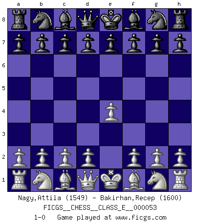 Last move : 1-0 2007 July 28 13:10:12 [Event "FICGS__CHESS__CLASS_E__000053"] [Site "FICGS"] [Date "2007.06.15"] [Round "1"] [White "Nagy,Attila"] [Black "Bakirhan,Recep"] [Result "1-0"] [WhiteElo "1549"] [BlackElo "1600"] 1.e4 1-0 This chess game has been lost on time (started : 2007.06.15 3:38:1) King's pawn Opening Player White won this chess game. Follow this game move after move (download)There are tough players and nice guys, and I'm a tough player. (Bobby Fischer) Nicht daß Diemer aus Opportunismus Mitglied der NSDAP geworden wäre. Er war ein Fanatiker, in allem, was er tat. (Hans Ree) No hay precio que no valga la pena por la cabellera del Rey enemigo. (Koblentz) La tactique, c'est ce que vous faites quand il y a quelque chose à faire; la stratégie, c'est ce que vous faites quand il n'y a rien à faire. (Savielli Tartacower) The Movers & Shakers of this world are those who play chess in the mornings and go to the disco in the evenings. (Dinesh De Silva)