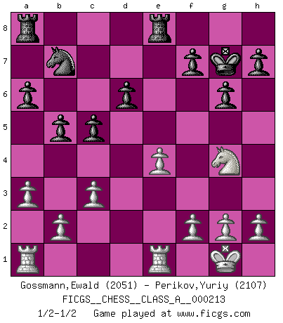 Last move : 1/2-1/2 2019 June 29 17:8:54 [Event "FICGS__CHESS__CLASS_A__000213"] [Site "FICGS"] [Date "2019.06.21"] [Round "1"] [White "Gossmann,Ewald"] [Black "Perikov,Yuriy"] [Result "1/2-1/2"] [WhiteElo "2051"] [BlackElo "2107"] 1.e4 e5 2.Nf3 Nc6 3.Bb5 a6 4.Ba4 Nf6 5.O-O b5 6.Bb3 Bb7 7.d3 Be7 8.Nc3 d6 9.a3 O-O 10.Be3 Qd7 11.Nd5 Nxd5 12.Bxd5 Nd8 13.Bxb7 Nxb7 14.c3 Bf6 15.d4 exd4 16.Bxd4 Bxd4 17.Nxd4 Rfe8 18.Re1 c5 19.Nf5 g6 20.Qg4 Kf8 21.Nh6 Qxg4 22.Nxg4 Kg7 1/2-1/2 Ruy Lopez : Archangelsk (counterthrust) variation Kingside Castling by player White (move 5) Kingside Castling by player Black (move 9) This chess game ended in a draw. Follow this game move after move (download)In Chess, as it is played by masters, chance is practically eliminated. (Emanuel Lasker) Meine Liebe ist Schach, Schach, Schach. Ich muss jeden Tag Schach spielen, deshalb fühle ich mich so stark. (Miguel Najdorf) El Ajedrez es el juego mas altamente simbólico, pero las agresiones estan por lo tanto aún mas francamente representadas en la partida. Tal vez comenzo como un juego de guerra; Algo como la representación de una batalla en miniatura entre las fuerzas de dos reinos. (Karl Meninger) Le succès, c'est être capable d'aller d'échec en échec sans perdre son enthousiasme. (Winston Churchill) I'm extremely disappointed. I send you out for exciting, new designer drugs, you come back with tomato sauce. (Gregory House, House M.D.)