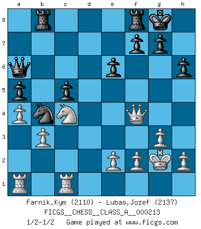 Last move : 1/2-1/2 2019 July 7 15:59:44 [Event "FICGS__CHESS__CLASS_A__000213"] [Site "FICGS"] [Date "2019.06.21"] [Round "1"] [White "Farnik,Kym"] [Black "Lubas,Jozef"] [Result "1/2-1/2"] [WhiteElo "2110"] [BlackElo "2137"] 1.Nf3 d5 2.d4 Nf6 3.c4 e6 4.g3 Be7 5.Bg2 O-O 6.O-O dxc4 7.Qc2 a6 8.a4 Bd7 9.Qxc4 Bc6 10.Bf4 Bd6 11.Qc1 a5 12.Nc3 Na6 13.Rd1 Nb4 14.Be5 Nd7 15.Qf4 Bxe5 16.Nxe5 Nxe5 17.Qxe5 Bxg2 18.Kxg2 c6 19.Ne4 Qb6 20.Nd6 Rad8 21.Nc4 Qa6 22.Rdc1 b6 23.Qc7 Rb8 24.b3 h6 25.Qf4 c5 26.dxc5 bxc5 1/2-1/2 Reti Opening Kingside Castling by player Black (move 5) Kingside Castling by player White (move 6) This chess game ended in a draw. Follow this game move after move (download)I won't play with you anymore. You have insulted my friend. - When an opponent cursed himself for a blunder. (Miguel Najdorf) Warum muß ich gegen diesen IDIOTEN verlieren? (Aaron Nimzowitsch) El Ajedrez moderno está demasiado preocupado con cosas como la estructura de Peones. Olvidenlo, el Jaque Mate termina la partida. (Nigel Short) Echiquier : carré parfait, comme la Jérusalem nouvelle décrite par l'auteur de l'Apocalypse, huit cases sur huit, exaltation du chiffre 4, symbole du cosmos aux quatre horizons... où le noir et le blanc, l'ombre et la lumière, le mal et le bien s'entremêlent et se conjuguent. (Robert Couffignal, Le Gambit du poète) 98% of all statistics are made up. (Author unknown)