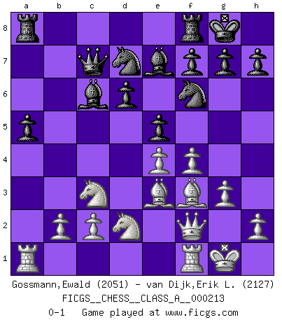 Last move : 0-1 2019 November 23 3:7:41 [Event "FICGS__CHESS__CLASS_A__000213"] [Site "FICGS"] [Date "2019.06.21"] [Round "1"] [White "Gossmann,Ewald"] [Black "van Dijk,Erik L."] [Result "0-1"] [WhiteElo "2051"] [BlackElo "2127"] 1.e4 c5 2.Nf3 d6 3.d4 cxd4 4.Nxd4 Nf6 5.Nc3 a6 6.Bg5 Nbd7 7.Be2 e6 8.O-O Be7 9.a4 O-O 10.a5 Qc7 11.Nb3 Ne5 12.Be3 Bd7 13.Nd2 Bc6 14.f4 Ned7 15.Bf3 e5 16.g3 b5 17.axb6 Nxb6 18.Qe2 a5 19.Qf2 Nbd7 0-1 Sicilian : Najdorf, 6.Bg5 Kingside Castling by player White (move 8) Kingside Castling by player Black (move 9) Player Black won this chess game. Follow this game move after move (download)Blessed be the memory of him who gave the world this immortal game. (A. G. Gardiner) Es ist nicht das erste mal, dass sich die FIDE dem Arabischen Geld gebeugt hat (über die FIDE WM 2004 in Lybien). (Larry Evans) Por la belleza de sus partidas, la claridad de su juego y lo brillante de sus ideas, Fischer se creó el mismo como un artista de la misma estatura como Brahms, Rembrandt y Shakespeare. (David Levy) Il a essayé de se convaincre qu'il pourrait empêcher toutes les erreurs et ne jamais perdre. L'horreur ! Gary Kasparov au sujet de Robert Fischer. A married woman is like a fish riding a bicycle. (Rodolfo d'Ettorre)
