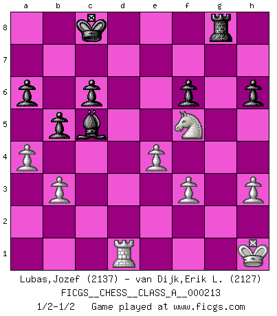 Last move : 1/2-1/2 2019 December 9 22:22:1 [Event "FICGS__CHESS__CLASS_A__000213"] [Site "FICGS"] [Date "2019.06.21"] [Round "1"] [White "Lubas,Jozef"] [Black "van Dijk,Erik L."] [Result "1/2-1/2"] [WhiteElo "2137"] [BlackElo "2127"] 1.e4 e5 2.Nf3 Nc6 3.Bb5 a6 4.Bxc6 dxc6 5.O-O Be6 6.d4 exd4 7.Nxd4 Bc4 8.Re1 c5 9.Nb3 Qxd1 10.Rxd1 Be2 11.Rd2 Bg4 12.Nc3 b6 13.h3 Bd7 14.Rd1 O-O-O 15.Bf4 Nf6 16.a4 h6 17.Nd2 Be6 18.f3 Nh5 19.Be5 f6 20.Bh2 g5 21.Nf1 Rxd1 22.Rxd1 c4 23.Nd5 Bc5+ 24.Kh1 Bxd5 25.Rxd5 Nf4 26.Bxf4 gxf4 27.g3 c6 28.Rd1 fxg3 29.Nxg3 b5 30.b3 cxb3 31.cxb3 Rg8 32.Nf5 1/2-1/2 Ruy Lopez : Exchange variation, 5.O-O Kingside Castling by player White (move 5) Queenside Castling by player Black (move 14) This chess game ended in a draw. Follow this game move after move (download)I am the best player in the world and I am here to prove it. (Bobby Fischer) Du weisst es gibt ein Problem mit Computern und Fernschach, wenn jeder eine Rating von 2450 hat. (John Christen Knudsen) Debemos de asegurarnos de que el Ajedrez no se convierta en un lenguaje muerto, muy interesante, pero tan solo para un grupo muy pequeño. (Sytze Faber) La vie et les Echecs sont tous les deux une lutte constante. (Lasker) Good luck. You're gonna need it. (Han Solo in Star Wars ep.6)