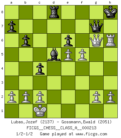 Last move : 1/2-1/2 2019 July 7 7:38:30 [Event "FICGS__CHESS__CLASS_A__000213"] [Site "FICGS"] [Date "2019.06.21"] [Round "1"] [White "Lubas,Jozef"] [Black "Gossmann,Ewald"] [Result "1/2-1/2"] [WhiteElo "2137"] [BlackElo "2051"] 1.e4 e6 2.d4 d5 3.Nc3 Nf6 4.Bg5 dxe4 5.Nxe4 Be7 6.Bxf6 Bxf6 7.Nf3 O-O 8.Qd2 Nd7 9.O-O-O b6 10.Nxf6+ Nxf6 11.Bd3 Qe7 12.Ne5 Bb7 13.Rhe1 Rfd8 14.Qf4 Nd7 15.Re3 Nxe5 16.dxe5 g6 17.Rh3 Qf8 18.Qh4 Qg7 19.Re3 c5 20.f4 Qf8 21.Rh3 h6 22.Qg4 Kg7 23.Rg3 c4 24.Bxg6 fxg6 25.Qxg6+ Kh8 26.Rxd8 Rxd8 27.f5 Bd5 28.Rh3 Qg7 29.Rxh6+ 1/2-1/2 French : Burn variation Kingside Castling by player Black (move 7) Queenside Castling by player White (move 9) This chess game ended in a draw. Follow this game move after move (download)Chess is a more highly symbolic game, but the aggressions are therefore even more frankly represented in the play. It probably began as a war game; that is, the representation of a miniature battle between the forces of two kingdoms. (Karl Meninger) Ja, jede Frau in Holland liebt mich bestimmt, und alle Männer hassen mich. (Loek van Wely) Bobby es el jugador de Ajedrez mas fino que este país jamás haya producido. Su memoria para las movidas, su brillantez en soñar combinaciones y su feróz determinación por la victoria son algo extraño. (John Collins) Je fais ceci parce que dans cinquante coups j'obtiendrai cela; je m'appelle Mikhail Moisevitch Botvinnik. (Botvinnik) A government big enough to give you everything you want is strong enough to take everything you have. (Thomas Jefferson)