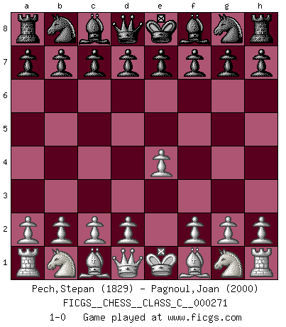 Last move : 1-0 2019 August 15 16:2:57 [Event "FICGS__CHESS__CLASS_C__000271"] [Site "FICGS"] [Date "2019.06.21"] [Round "1"] [White "Pech,Stepan"] [Black "Pagnoul,Joan"] [Result "1-0"] [WhiteElo "1829"] [BlackElo "2000"] 1.e4 1-0 This chess game has been lost on time (started : 2019.06.21 21:58:46) King's pawn Opening Player White won this chess game. Follow this game move after move (download)There are two classes of men; those who are content to yield to circumstances and who play whist; those who aim to control circumstances, and who play Chess. (Mortimer Collins) Du musst nicht gut spielen, es reicht, wenn du besser spielst als dein Gegner. (Anonymous) Vive, pierde y aprende al observar a tu oponente como gana. (Amber Steenbock) Les Echecs ne sont pas pour les âmes timides. Ils requièrent un homme entier, qui ne s'arrête pas aveuglément à ce qui a été déjà établi, mais qui tente individuellement de sonder les profondeurs du jeu. (W. Steinitz) The smarter you play, the luckier you'll be. (Mark Pilarski)
