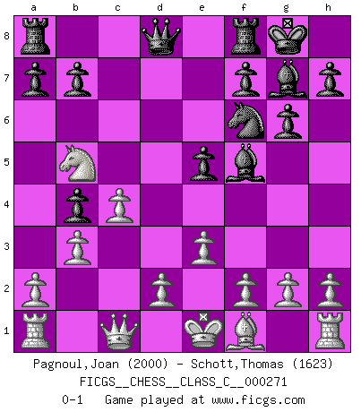 Last move : 0-1 2019 August 31 5:25:19 [Event "FICGS__CHESS__CLASS_C__000271"] [Site "FICGS"] [Date "2019.06.21"] [Round "1"] [White "Pagnoul,Joan"] [Black "Schott,Thomas"] [Result "0-1"] [WhiteElo "2000"] [BlackElo "1623"] 1.c4 c5 2.b3 Nc6 3.Na3 Nf6 4.Bb2 g6 5.Qc2 Bg7 6.Nf3 d6 7.Bc3 O-O 8.e3 Nb4 9.Bxb4 cxb4 10.Nb5 Bf5 11.Qc1 e5 12.Nxe5 dxe5 0-1 English : Symmetrical variation Kingside Castling by player Black (move 7) Player Black won this chess game. Follow this game move after move (download)Fischer was a master of clarity and a king of artful positioning. His opponents would see where he was going but were powerless to stop him. (Bruce Pandolfini) Frage des Reporters: -Worin besteht das Ziel von Gambiteröffnungen? Antwort: -Auf Kosten der Partie einen Ruf als Angriffspieler zu erwerben.- (Siegbert Tarrasch) Hay jugadores fuertes y personas amables y yo soy un jugador fuerte. (Bobby Fischer) Votre prénom est 'Tactique', votre deuxième prénom est 'Tactique' et votre nom est 'Tactique'. (Ken Smith) We're missing something. (Gregory House, House M.D.)