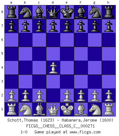 Last move : 1-0 2019 August 2 10:29:54 [Event "FICGS__CHESS__CLASS_C__000271"] [Site "FICGS"] [Date "2019.06.21"] [Round "1"] [White "Schott,Thomas"] [Black "Habanera,Jerome"] [Result "1-0"] [WhiteElo "1623"] [BlackElo "1600"] 1.d4 1-0 This chess game has been lost on time (started : 2019.06.21 21:58:46) Queen's pawn Player White won this chess game. Follow this game move after move (download)What would Chess be without silly mistakes ? (Kurt Richter) Die jungen Leute sollen verstehen, dass sie noch etwas von mir lernen können und müssen. (Viktor Kortschnoi) Aún deseo matar a Fischer. (Boris Spassky) Le joueur d'Echecs qui veut atteindre le top est obligé de développer son propre credo créatif. Alexeï Stepanovicth Souétine. Il est facile d'écrire des livres ! Ce qui est difficile, c'est de jouer ! (Alexeï Stepanovicth Souétine) Creativity is allowing yourself to make mistakes. Art is knowing which ones to keep. (Scott Adams)