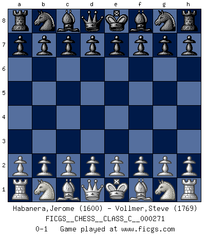 Last move : 0-1 2019 August 1 8:39:49 [Event "FICGS__CHESS__CLASS_C__000271"] [Site "FICGS"] [Date "2019.06.21"] [Round "1"] [White "Habanera,Jerome"] [Black "Vollmer,Steve"] [Result "0-1"] [WhiteElo "1600"] [BlackElo "1769"] 0-1 This chess game has been lost on time (started : 2019.06.21 21:58:46) Player Black won this chess game. Follow this game move after move (download)All Chess players should have a hobby. (Savielly Tartakower) Gegen einen Schachcomputer zu verlieren ist wie Löcher in den Strümpfen zuhaben. Es ist nicht peinlich, solange man der einzige ist der es weiß. (Anonymous) El Ajedrez no es como la vida... ¡tiene reglas!. (Mark Pasternak) Les erreurs sont comme les malheurs, elles n'arrivent jamais seules. (Siegbert Tarrasch) Don't anthropomorphize computers - they hate it. (Anonymous)