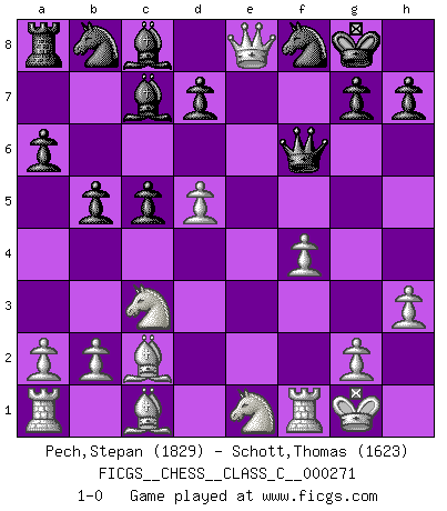 Last move : 1-0 2019 September 22 11:35:41 [Event "FICGS__CHESS__CLASS_C__000271"] [Site "FICGS"] [Date "2019.06.21"] [Round "1"] [White "Pech,Stepan"] [Black "Schott,Thomas"] [Result "1-0"] [WhiteElo "1829"] [BlackElo "1623"] 1.d4 Nf6 2.c4 e6 3.Nf3 c5 4.d5 exd5 5.cxd5 Bd6 6.Nc3 O-O 7.e4 Re8 8.Bd3 a6 9.Bc2 b5 10.O-O Ng4 11.h3 Ne5 12.Ne1 Bc7 13.f4 Ng6 14.e5 Nf8 15.Qh5 f5 16.exf6 Qxf6 17.Qxe8 1-0 Queen's pawn game Kingside Castling by player Black (move 6) Kingside Castling by player White (move 10) Player White won this chess game. Follow this game move after move (download)Some part of a mistake is always correct. (Savielly Tartakover) Die Auseinandersetzung mit Karpow war politisch geprägt. Er stand für das kommunistische System, wurde von dessen Repräsentanten gehätschelt. Ich war der Oppositionelle. Jeder Schachweltmeister spiegelt auch die gesellschaftlichen Verhältnisse wider. Kramnik steht für die Börsen-Generation des Neuen Markts, ideologiefrei, zahlenfixiert. (Garry Kasparov) El Ajedrez es sobre todo, ¡una pelea!. (Emanuel Lasker) RxDa4 pat (...) The age of a woman doesn't mean a thing. The best tunes are played on the oldest fiddles. (Ralph Waldo Emerson)