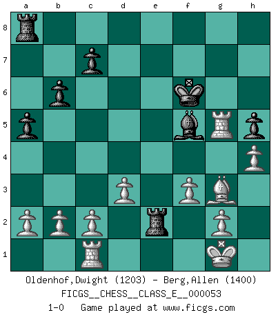 Last move : 1-0 2007 November 15 7:14:6 [Event "FICGS__CHESS__CLASS_E__000053"] [Site "FICGS"] [Date "2007.06.15"] [Round "1"] [White "Oldenhof,Dwight"] [Black "Berg,Allen"] [Result "1-0"] [WhiteElo "1203"] [BlackElo "1400"] 1.e4 e5 2.Nf3 Nc6 3.Nc3 Nf6 4.Bc4 Nxe4 5.Bxf7+ Kxf7 6.Nxe4 Be7 7.d3 h6 8.O-O d5 9.Ng3 b6 10.Re1 a5 11.Nxe5+ Nxe5 12.Rxe5 Qd6 13.Qf3+ Bf6 14.Rxd5 Qe6 15.Rh5 Qg4 16.Qxg4 Bxg4 17.Rb5 Rhe8 18.Bf4 Re7 19.Ne4 g5 20.Bg3 h5 21.Nxg5+ Bxg5 22.Rxg5 Re2 23.f3 Kf6 24.h4 Bf5 25.Rc1 1-0 Four knights : Italian variation Kingside Castling by player White (move 8) Player White won this chess game. Follow this game move after move (download)Discovered check is the dive bomber of the Chessboard. (Reuben Fine) Obwohl ich alt bin, darf mir niemand den Finger in den Mund stecken, sonst beisse ich. (Wilhelm Steinitz) Nunca antes ha habido un jugador de Ajedrez con tal conocimiento a fondo de las complejidades del juego y una inmensa voluntad absolutamente indomable de ganar. Yo pienso que Fischer es el jugador mas grande que jamás haya existido. (Lisa Lane) Même un GMI sait rarement calculer sur plus de cinq coups une attaque à sacrifices. (Rudolf Spielmann) Heh, heh, heh. Time to abandon ship. (General Grievous in Star Wars ep.3)