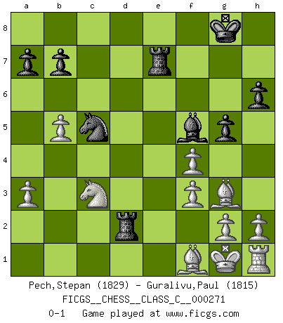 Last move : 0-1 2019 December 3 11:37:25 [Event "FICGS__CHESS__CLASS_C__000271"] [Site "FICGS"] [Date "2019.06.21"] [Round "1"] [White "Pech,Stepan"] [Black "Guralivu,Paul"] [Result "0-1"] [WhiteElo "1829"] [BlackElo "1815"] 1.c4 e6 2.Nc3 Nf6 3.d4 Bb4 4.Qc2 d5 5.cxd5 exd5 6.Bg5 c5 7.dxc5 h6 8.Bh4 O-O 9.e3 Be6 10.a3 Bxc3+ 11.Qxc3 g5 12.Bg3 Ne4 13.Qc2 Nc6 14.b4 f5 15.Ne2 Qf6 16.Rd1 f4 17.exf4 Bf5 18.Qb3 Rae8 19.b5 Na5 20.Qxd5+ Rf7 21.f3 Nc3 22.Qd4 Qxd4 23.Rxd4 Nb3 24.Rd8 Rxd8 25.Nxc3 Re7+ 26.Kf2 Rd2+ 27.Kg1 Nxc5 0-1 This chess game has been lost on time (started : 2019.06.21 21:58:46) English Opening Kingside Castling by player Black (move 8) Player Black won this chess game. Follow this game move after move (download)I'm not afraid of Spassky. The world knows I'm the best. You don't need a match to prove it. (Bobby Fischer) Wenn es im Universum noch irgendwo intelligente Lebewesen gibt, dann kennen sie Go. (Emanuel Lasker) Puntos débiles o agujeros en la posición de tu oponente deben de ser ocupados por piezas, no Peones. (Siegbert Tarrasch) La vie et les Echecs sont tous les deux une lutte constante. (Lasker) The Internet is the first thing that humanity has build that humanity doesn't understand, the largest experiment in anarchy that we have ever had. (Eric Schmidt)