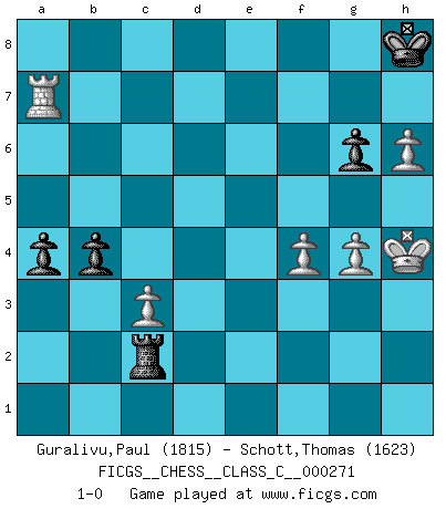 Last move : 1-0 2019 November 5 0:14:22 [Event "FICGS__CHESS__CLASS_C__000271"] [Site "FICGS"] [Date "2019.06.21"] [Round "1"] [White "Guralivu,Paul"] [Black "Schott,Thomas"] [Result "1-0"] [WhiteElo "1815"] [BlackElo "1623"] 1.d4 Nf6 2.c4 g6 3.Nc3 d5 4.cxd5 Nxd5 5.Bd2 Nb6 6.Nf3 Bg7 7.Qc1 Nc6 8.e3 O-O 9.Be2 e5 10.dxe5 Nxe5 11.Nxe5 Bxe5 12.O-O Be6 13.e4 c6 14.Bf4 Qc7 15.Bxe5 Qxe5 16.Rd1 f5 17.Qg5 Qg7 18.exf5 Rxf5 19.Qg3 Nd5 20.Re1 Nxc3 21.Bd3 Rf6 22.bxc3 Qf7 23.Re2 Rf8 24.Rae1 b5 25.a3 a6 26.h4 Bc4 27.Re7 Qd5 28.Bxc4 Qxc4 29.h5 Qf4 30.Qxf4 Rxf4 31.h6 R8f7 32.R7e6 R7f6 33.Rxf6 Rxf6 34.Re8+ Rf8 35.Re6 Rf4 36.Rxc6 Ra4 37.Rc8+ Kf7 38.Rc7+ Kg8 39.Rg7+ Kh8 40.Ra7 Kg8 41.Rg7+ Kh8 42.g3 Rxa3 43.Rc7 Kg8 44.Rg7+ Kh8 45.Rc7 Kg8 46.Kg2 a5 47.Rg7+ Kf8 48.Rxh7 Kg8 49.Rc7 a4 50.Kh3 Ra2 51.f4 Rc2 52.Kh4 Kh8 53.g4 b4 54.Ra7 1-0 King's Indian defense, 3.Nc3 Kingside Castling by player Black (move 8) Kingside Castling by player White (move 12) Player White won this chess game. Follow this game move after move (download)The game of Chess is not merely an idle amusement; several very valuable qualities of the mind are to be acquired and strengthened by it, so as to become habits ready on all occasions; for life is a kind of Chess. (Benjamin Franklin) Dass jemand wie Surab Asmaiparaschwili, der selbst Elopunkte gekauft hat , Vize-Präsident der Fide werden konnte, sagt schon einges über den Zustand dieser Organisation aus. (Joel Lautier) Todos los Maestros de Ajedrez fueron un día unos principiantes. (Chernev) Psychologiquement, tu dois avoir confiance en toi même, mais cette confiance doit être basée sur des faits. (Robert Fischer) You have to believe in yourself. (Sun Tzu)