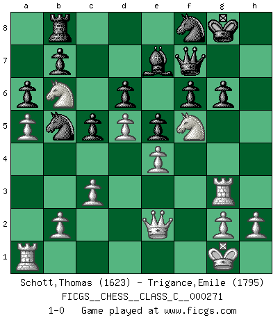 Last move : 1-0 2019 July 18 7:14:24 [Event "FICGS__CHESS__CLASS_C__000271"] [Site "FICGS"] [Date "2019.06.21"] [Round "1"] [White "Schott,Thomas"] [Black "Trigance,Emile"] [Result "1-0"] [WhiteElo "1623"] [BlackElo "1795"] 1.d4 c5 2.d5 e5 3.e4 d6 4.Nc3 Nf6 5.Be2 Be7 6.Nf3 O-O 7.O-O Bg4 8.Nd2 Bxe2 9.Qxe2 Ne8 10.Nc4 Nd7 11.a4 a6 12.a5 Rb8 13.f4 f6 14.f5 Rf7 15.Bd2 Nc7 16.Na4 Nb5 17.c3 Qf8 18.Rf3 g5 19.fxg6 hxg6 20.Rg3 Rg7 21.Bh6 Qf7 22.Bxg7 Qxg7 23.Nab6 Nf8 24.Ne3 Qf7 25.Nf5 1-0 Semi-Benoni (`blockade variation') Kingside Castling by player Black (move 6) Kingside Castling by player White (move 7) Player White won this chess game. Follow this game move after move (download)Tactics flow from a superior position. (Bobby Fischer) Irgendwie scheint mir sonntags früh um 9 Uhr der Killerinstinkt verloren gegangen zu sein. (Alexej Shirov) Cada Peón es una Reina en potencia. (James Mason) Botvinnik disait en comparant les échecs à la musique: Il existe une science dont le but est l'étude de l'acoustique et des sons. Mais il y a aussi un art qui se sert de l'océan des sons : c'est la musique. De toute évidence, il en est de même pour la pensée. La logique est l'étude des lois de la réflexion et les échecs reflètent, en tant qu'art, le côté logique de la réflexion, sous la forme d'images artistiques... Extrait de Fischer - Spassky, Reykjavik 1972 par Alexander & F. Wyndham (Ed. Solar), p 37. When it is a question of money, everybody is of the same religion. (Voltaire)
