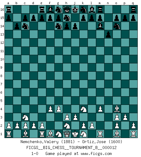 Last move : 1-0 2019 August 4 1:50:14 [Event "FICGS__BIG_CHESS__TOURNAMENT_B__000012"] [Site "FICGS"] [Date "2019.06.22"] [Round "1"] [White "Nemchenko,Valery"] [Black "Ortiz,Jose"] [Result "1-0"] [WhiteElo "1881"] [BlackElo "1600"] 1.j2-k4 j15-g14 2.p1-o3 p16-o14 3.g2-g4 b15-b14 4.b1-c3 c16-b15 5.m2-m4 n15-n13 6.f2-f4 o16-m14 7.p2-p3 b15-o3 8.n2-o3 b16-c14 9.l1-o4 1-0 This big chess game has been lost on time (started : 2019.06.22 19:41:34) Follow this game move after move (download)It is difficult to play against Einstein's theory --on his first loss to Fischer. (Mikhail Tal) Ich bin Weltmeister und muß mit niemandem irgend etwas diskutieren. (Viswanathan Anand) De todos mis libros Rusos, la defensa contiene y difunde el 'calor' mas grande que pudiese verse extraño al observar lo supremamente abstracto que el Ajedrez supuestamente es. (Vladimir Nabokov) Les Echecs ne sont pas pour les âmes timides. Ils requièrent un homme entier, qui ne s'arrête pas aveuglément à ce qui a été déjà établi, mais qui tente individuellement de sonder les profondeurs du jeu. (W. Steinitz) Every now and then a man's mind is stretched by a new idea and never shrinks back to its former dimensions. (Oliver Wendell Holmes, Sr.)